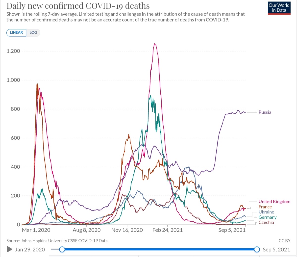 https://ourworldindata.org/explorers/coronavirus-data-explorer?zoomToSelection=true&time=2020-03-01..latest&facet=none&pickerSort=desc&pickerMetric=total_deaths&hideControls=true&Metric=Confirmed+deaths&Interval=7-day+rolling+average&Relative+to+Population=false&Align+outbreaks=false&country=GBR~DEU~FRA~CZE~UKR~RUS