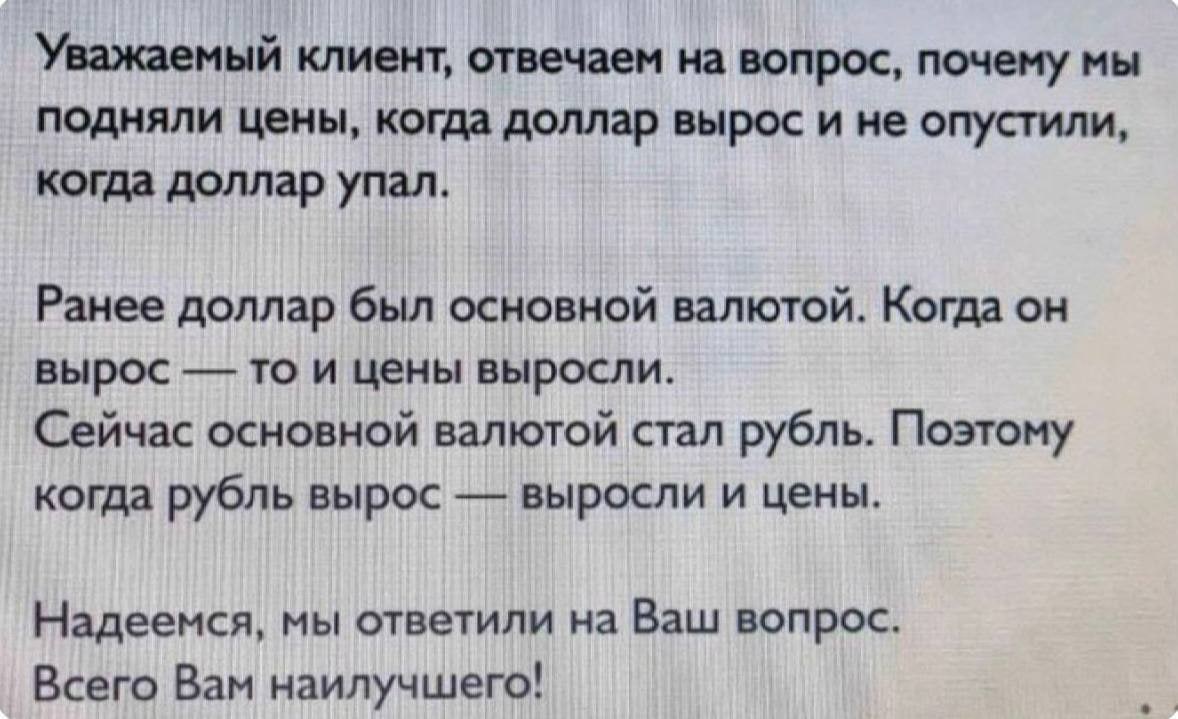 А когда доллар с 30 рублей  до 100 дошёл, потом до 70 упал-цены вернулись к тому уровню, когда он по 30 был? Хрен там.